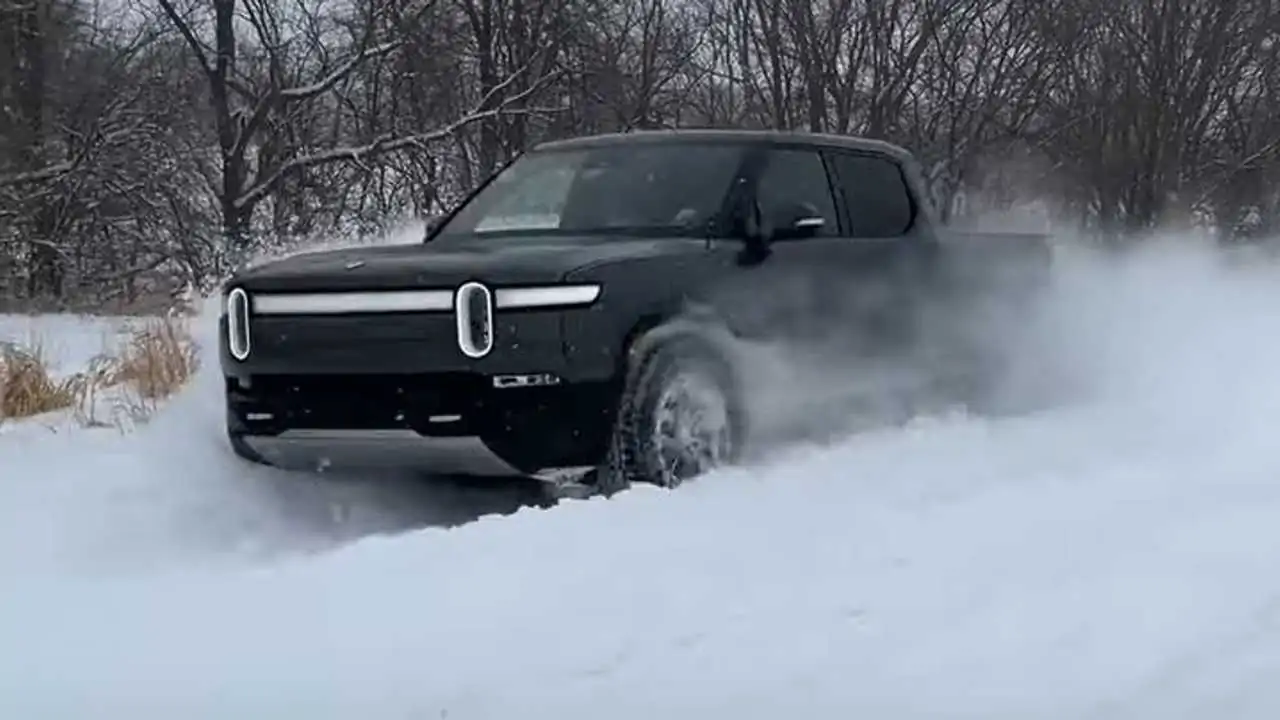 The R1T is an all-wheel-drive electric pickup truck that has several different drive modes, including one specifically designed for tackling snow. As you'll see in the video, the family drives in the deep snow just as if there's really no snow at all. They don't hesitate to push the pedal around curves, and the truck remains confident and controlled throughout the testing.
