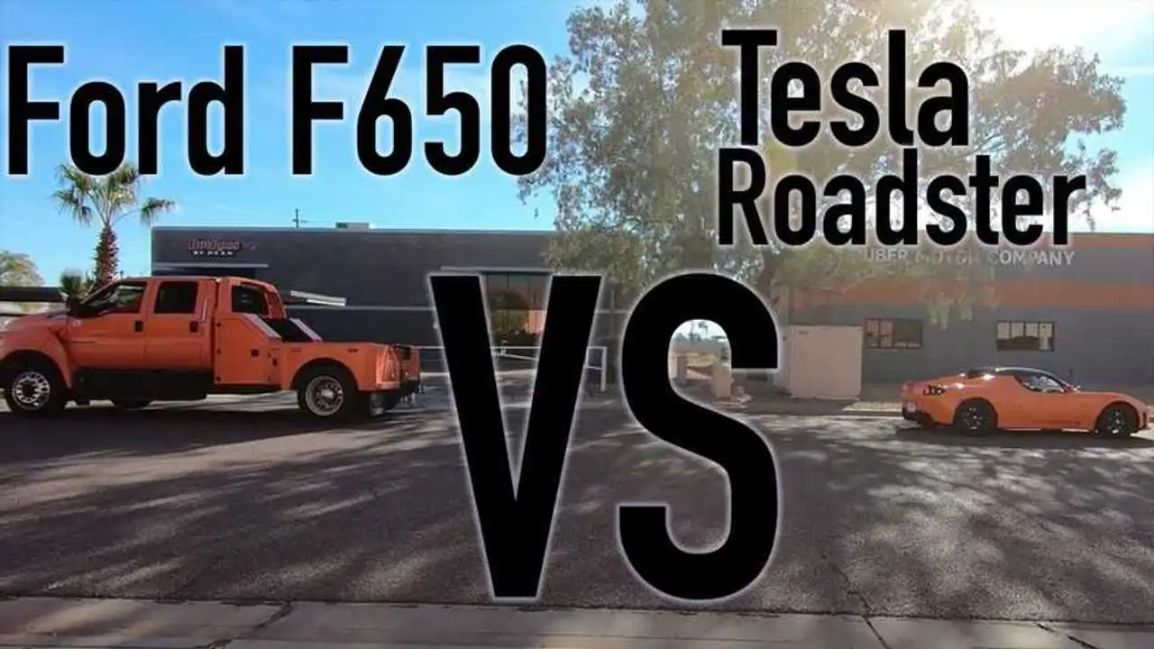 Watch Tesla Roadster Take On Ford F-650 Pickup Truck In Tug Of War Battle
